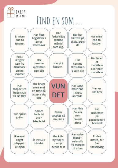 Det gælder om at finde personer, der passer til hvert udsagn – og skrive deres navn i feltet. Den første, der får alle felter udfyldt, eller kommer først til midten, vinder legen! 🏆