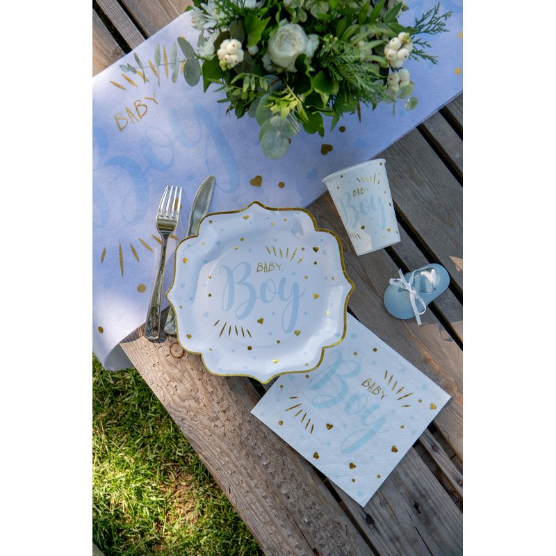 Disse charmerende servietter er perfekte til at fejre en kommende lille prins! De er fremstillet i 3-lags papir og prydet med fine lyseblå elemter og gyldent “Baby Boy” tryk. Pakken indeholder 20 stk., hver med målene 16,5 x 16,5 cm, som er ideel til både baby showers og gender reveal fester. Mix dem med f.eks. lyseblå servietter for et mere festligt udtryk på bordet!