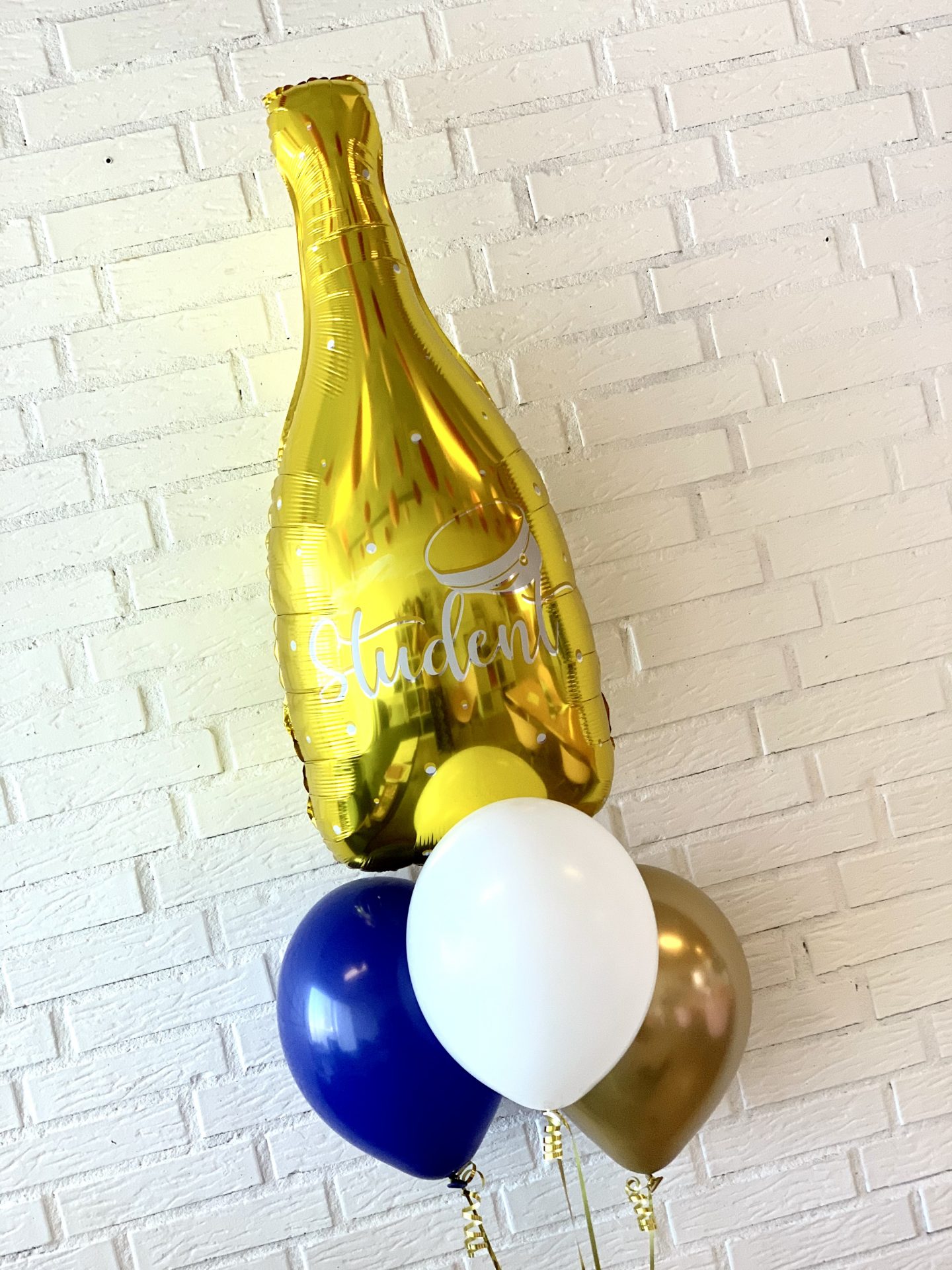 Send en unik hilsen til årets student med denne flotte, svævende ballon buket bestående af; en guld champagneflaske ballon med hvid “Student” på og tre latex balloner i en valgfri farve.