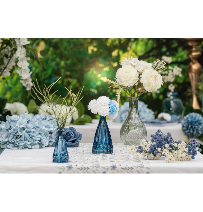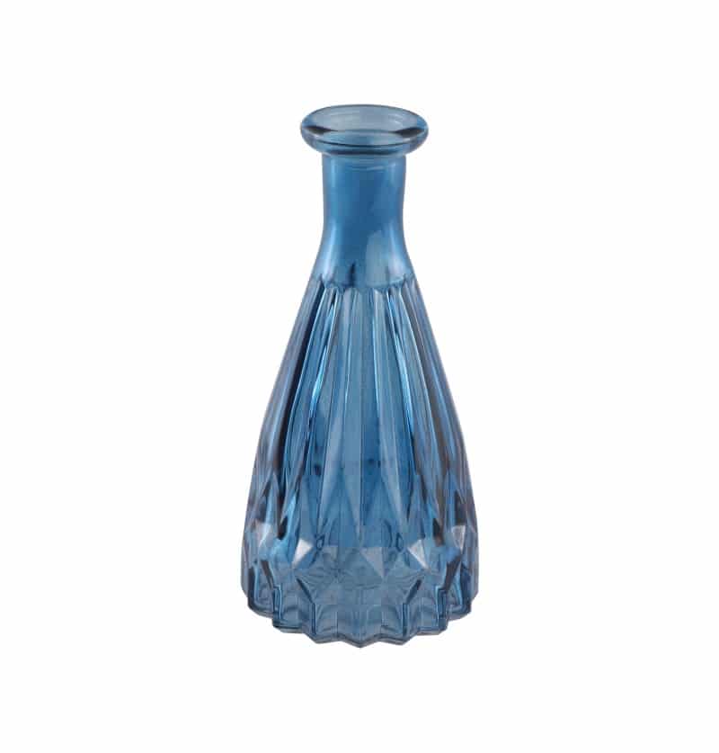 Skab en elegant bordpynt med denne slanke blå glasvase i tidløst design. Den fine riflede struktur og det dekorative slebne mønster i bunden får lyset til at spille smukt i glasset.