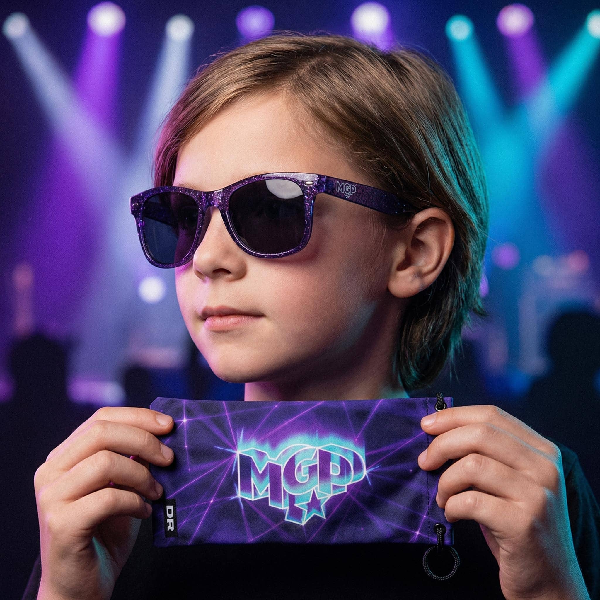 De mørke glas og lilla stel med glimmer giver den helt rette show-effekt – perfekt til at heppe, danse og nyde musikken med stil.