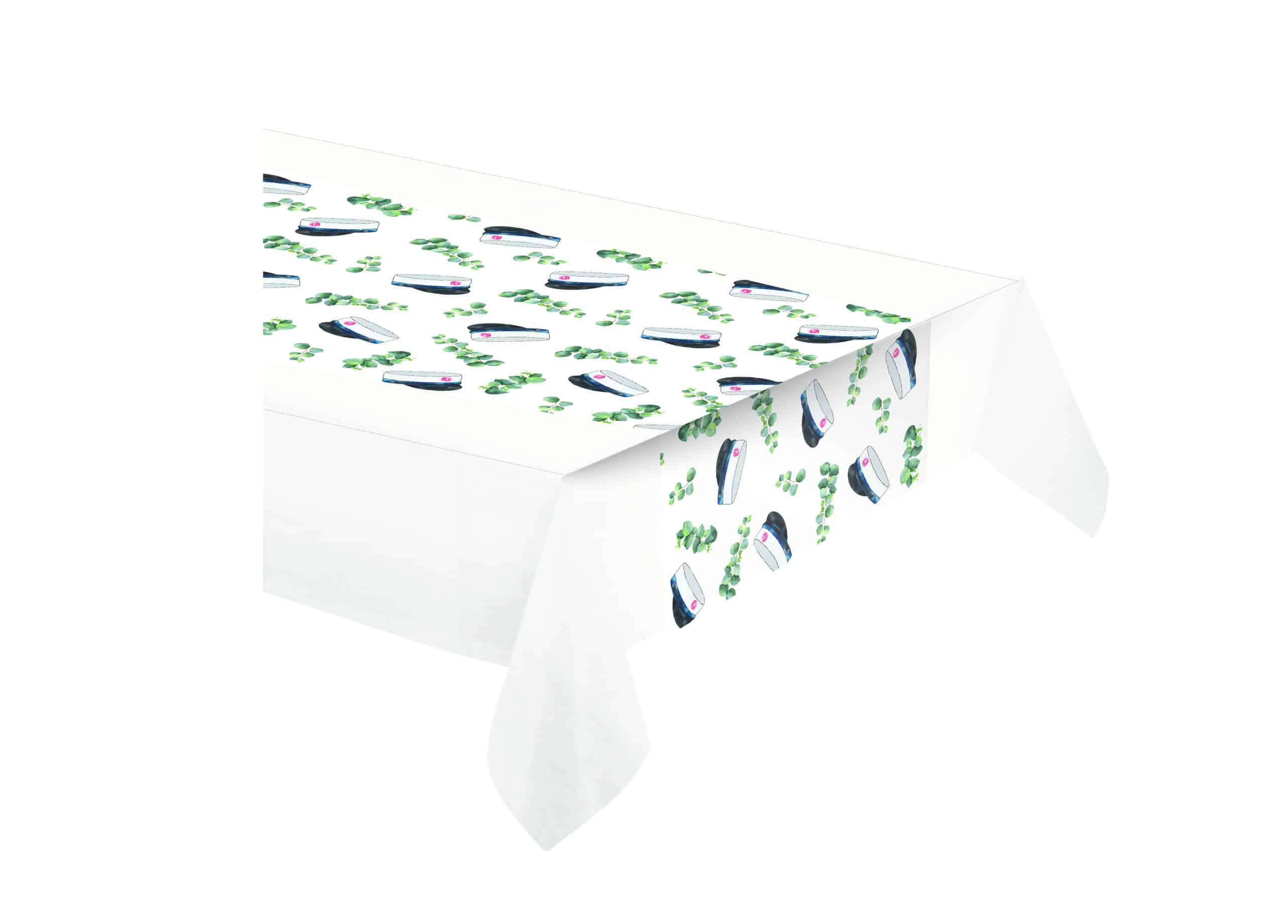 Skab en festlig og elegant stemning med denne hvide bordløber med blå studenterhuer og grønne blade. Det enkle, men dekorative design passer perfekt til den blå students store dag og bringer både tradition og sommerstemning til borddækningen.