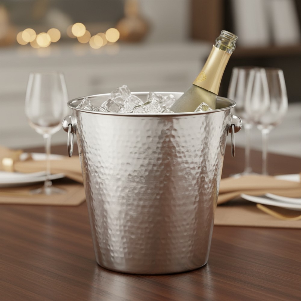 Champagnekøleren er perfekt til at holde bobler, vin eller andre drikkevarer dejligt kolde gennem hele festen. Det smukke hammerede mønster giver et stilfuldt og luksuriøst udtryk, som passer perfekt til bryllup, nytår, fødselsdag, reception og andre festlige anledninger 🥂