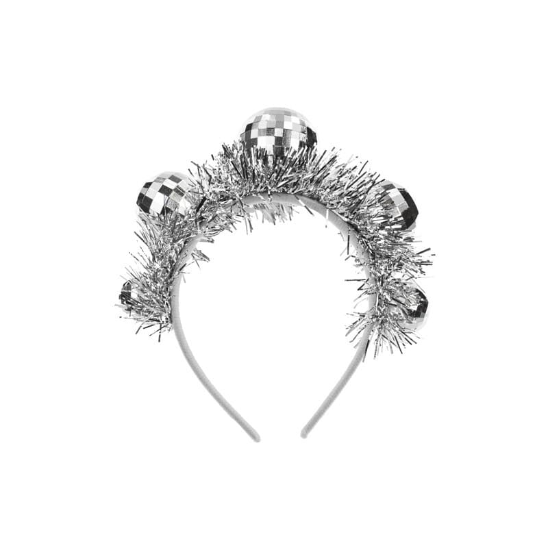 Er du klar til at funk’e igennem? Med denne glitrende hårbøjle er du midtpunktet på ethvert dansegulv! De små spejlkugler reflekterer lyset, og sølvtinsellen tilføjer det ekstra bling, der får festen til at skinne.