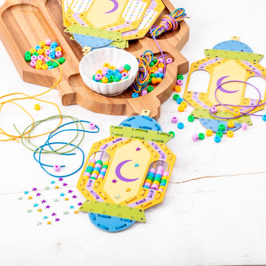 Pynt dine helt egne lanterner med flotte perler og snor. Perfekt til en børnevenlig aktivitet til Ramadan og Eid. Pynt de farverige lanterner med snor, perler måner og stjerner. Desuden får du snor med til at hænge dem op. Du får 6 lanterner i pakken. Mål: 13×23 cm.