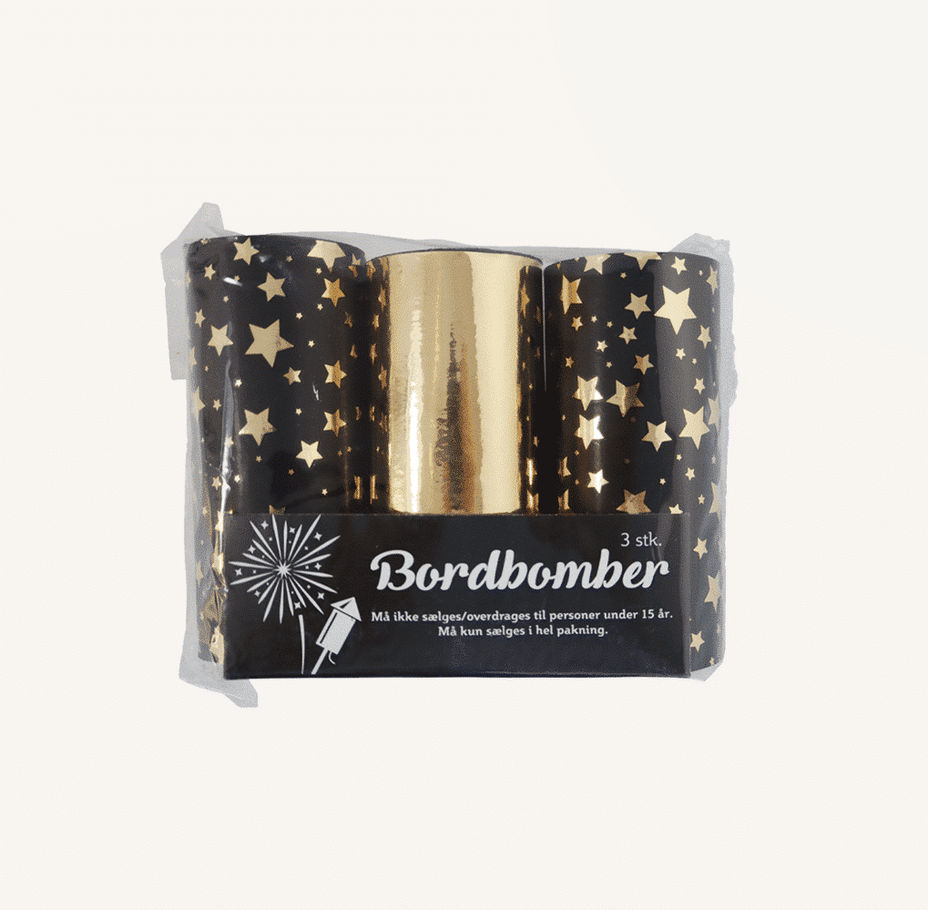 Intet siger godt nytår som en bordbombe! Og i denne pakke får du hele 3 stk. i guld design – 1 stk. helt i guld og 2 stk. med guld stjerner på. Bordbomberne ser festlige ud på nytårsbordet og når du tænder dem kan I glæde jer til en regn af konfettistjerner i sølv og guld. Så skyd nytåret ind med disse flotte bordbomber.