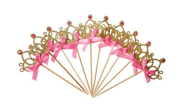 Sød kagepynt med glimmer guld krone og lyserød sløjfe. Kan bruges til at pynte kagen eller til maden.