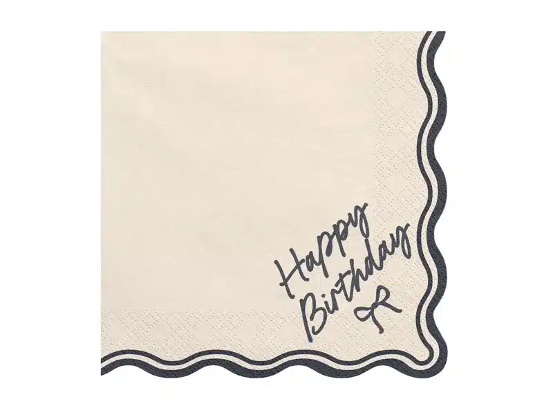 Skab en stilfuld og gennemført borddækning med disse fine “Happy Birthday” sløjfe servietter i beige og sort 🎀 Den elegante farvekombination og det dekorative birthday-print gør dem perfekte til en moderne fødselsdagsfejring med et feminint og festligt udtryk.