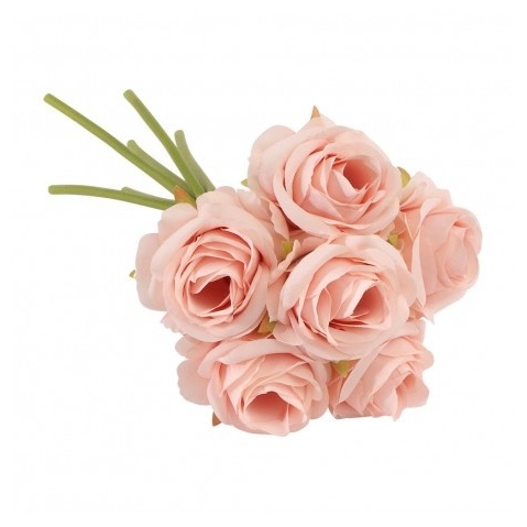 Et veldækket bord får et blidt udtryk med denne buket af naturtro, lyserøde roser. Uden behov for vand eller pleje står de skarpt fra gæsterne ankommer, til festen slutter. De seks roser er bundet i en samlet buket, som gør dem lette at placere præcis, hvor du ønsker dem.