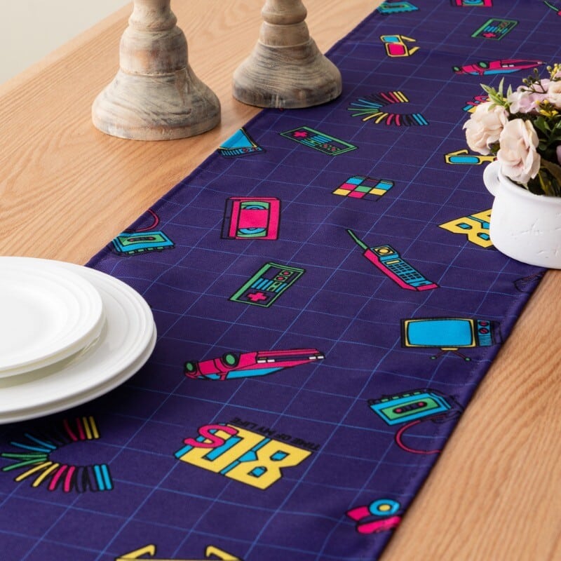 Hold den fedeste 80’er fest eller neonfest, så pynt bordet med denne lilla bordløber, hvor på der er en masse 80’er og neon ting.
