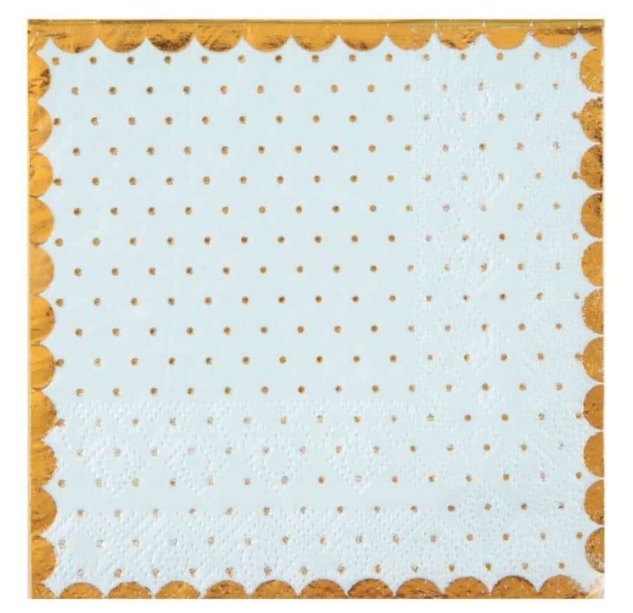 De mega flotte lyseblå servietter med guld prikker og kant er perfekt til en barnedåb, baby shower eller sommerfest.