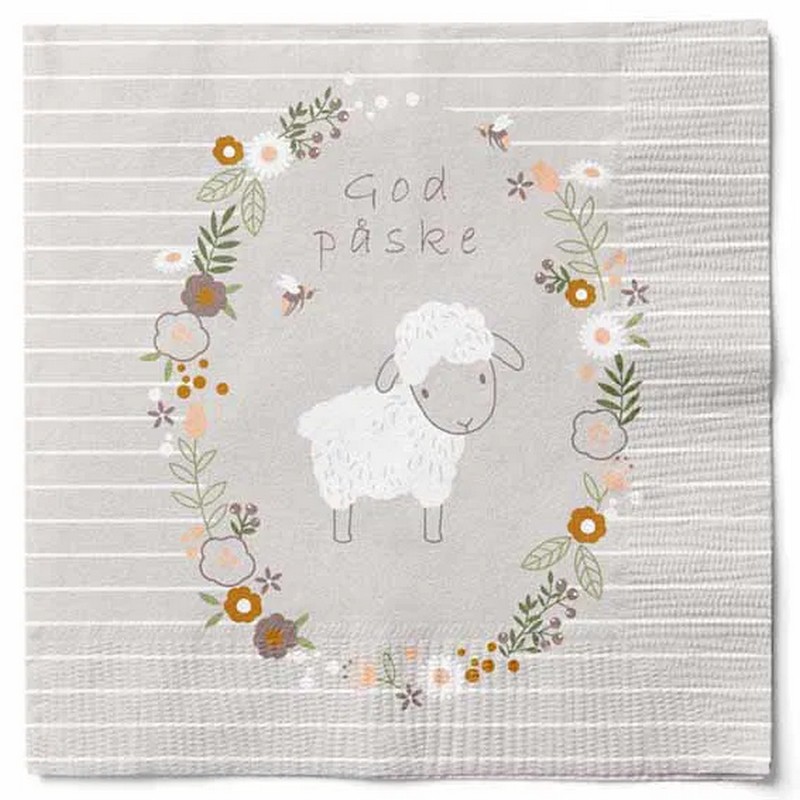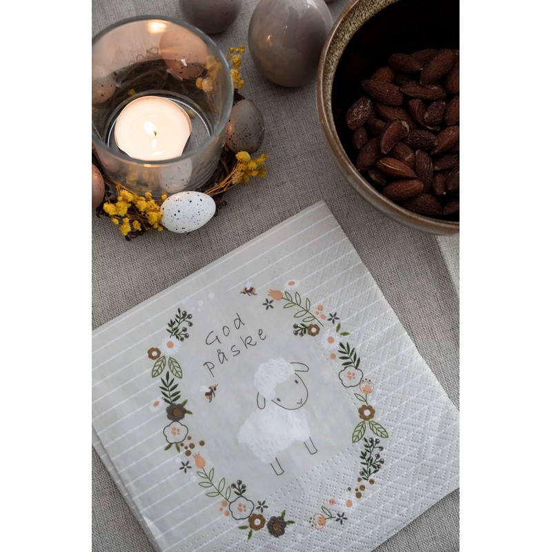 Skab påskestemning med disse fine frokostservietter, hvor et sødt får er omkranset af en blomsterkrans og teksten “God påske”. De grå servietter med smukke blomsterdetaljer giver dit påskebord et stemningsfuldt udtryk.
