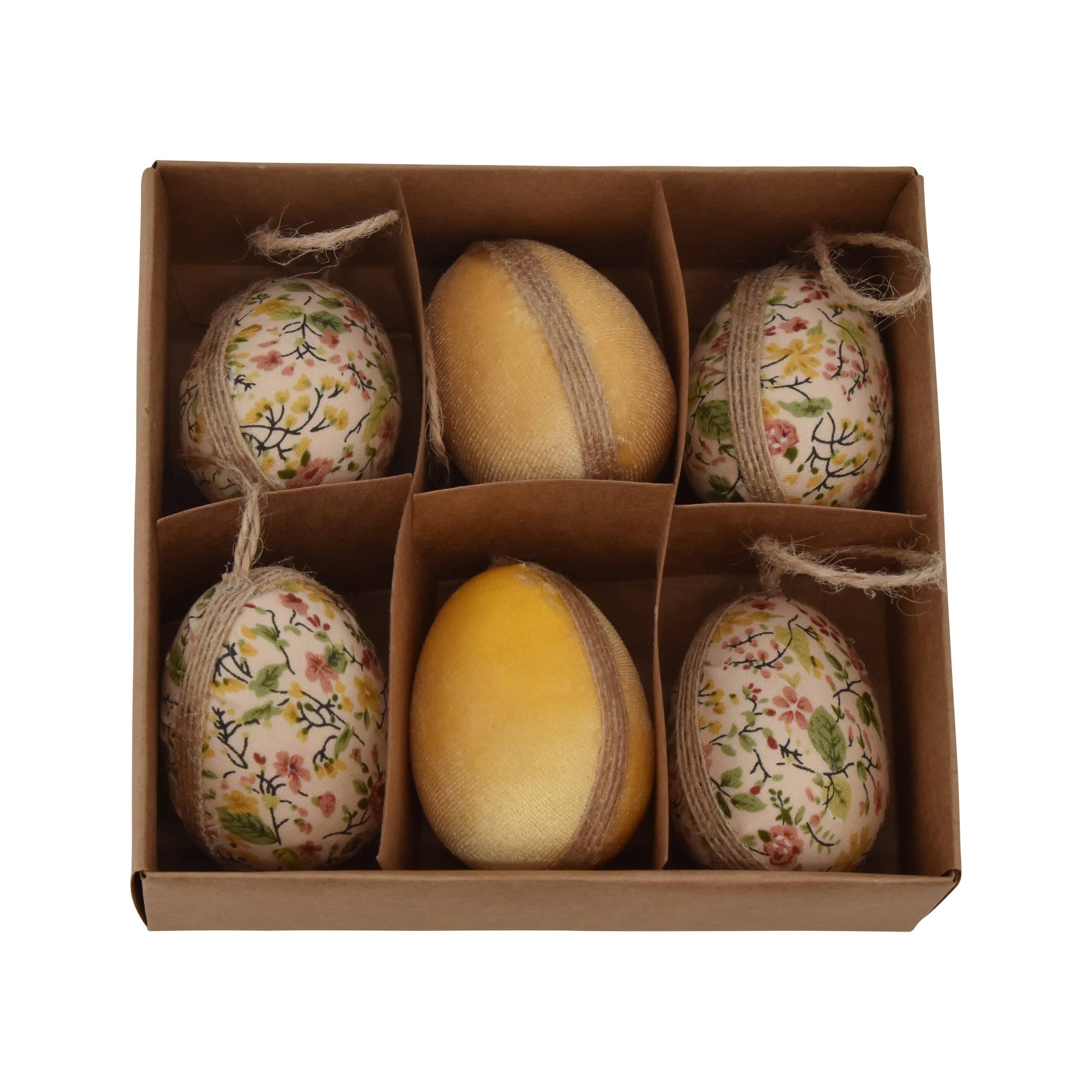 Pynt flot op til påske med disse 6 stk. flotte, håndlavede påskeæg i stof. Sættet består af to slags; 2 stk. i farven gul og 4 stk. med gule blomster. Påskeæggene kan hænges op eller bruge på bordet. Brug dem til opdækning eller som pynt til din påskefrokost. Indhold: 6 stk. / Mål: 6 x 6 cm