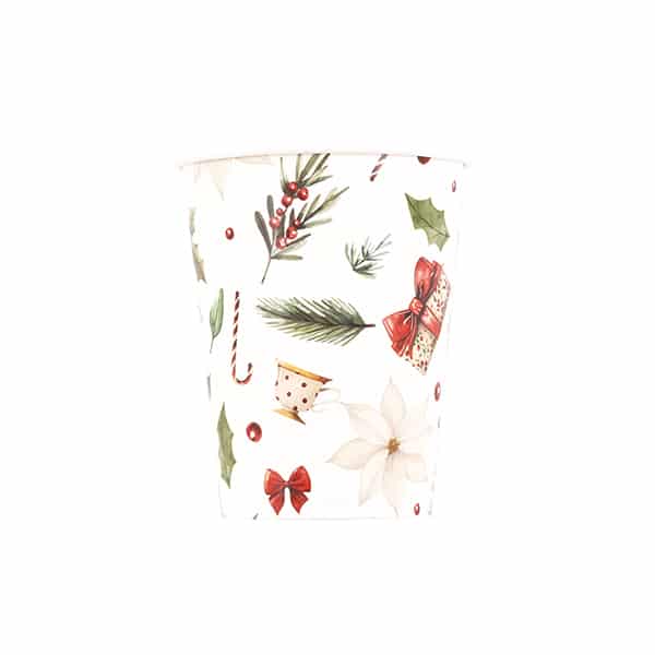 Gør juledrikken endnu hyggeligere med disse fine papkrus pyntet med klassiske juleelementer som gaver, kristtjørn, sløjfer og slikstok. Perfekte til juledrikke for både store og små! 🍫✨