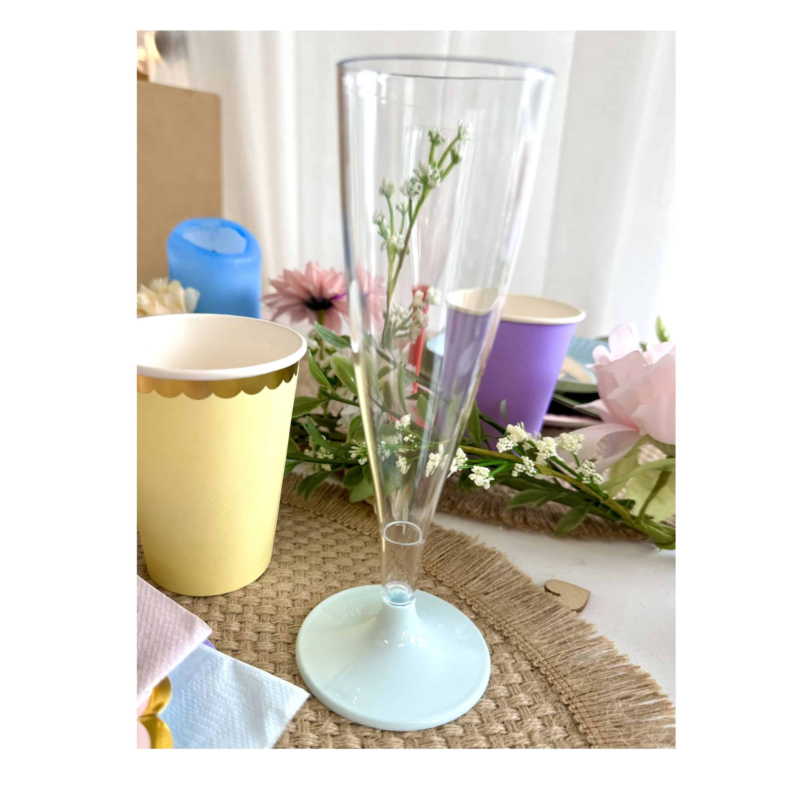 Her kan du købe et plastik champagneglas med pastel blå fod, som kan holde hele dagen. Plastikken er ekstra kraftig, som gør at glasset holder længere.