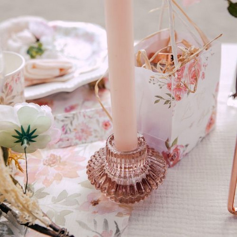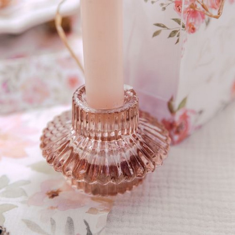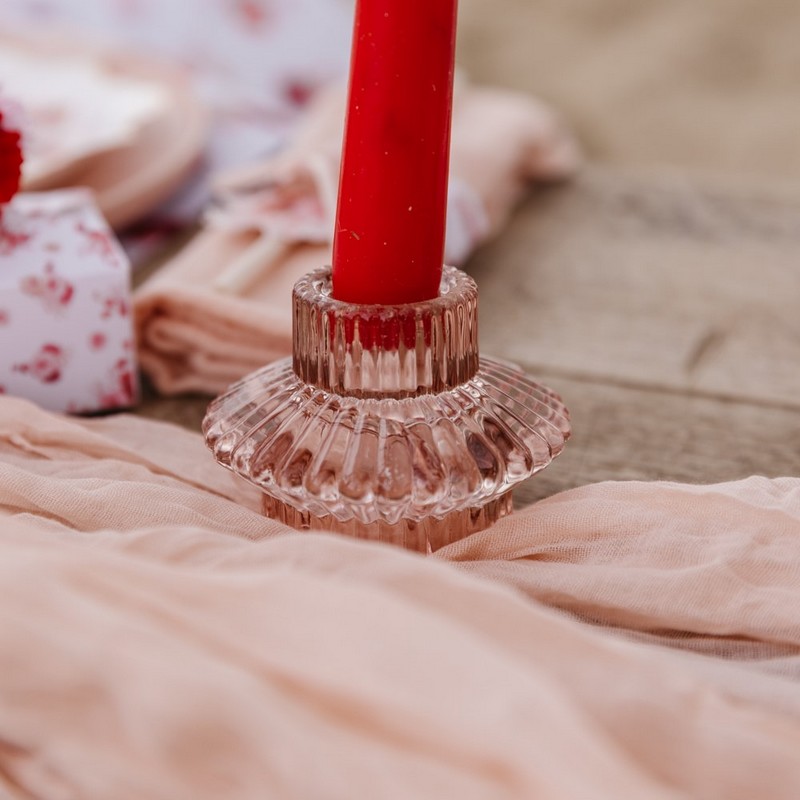 Skab en romantisk stemning med denne elegante lysestage i lyserød glas. Den dobbelte, riflede struktur giver et smukt lysspil, når stearinlyset er tændt, og den delikate rosa nuance spreder et varmt skær i rummet.