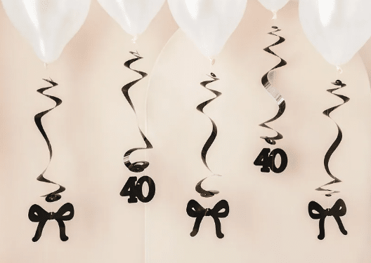 Skab en elegant og festlig stemning til 40-års fødselsdagen med disse sorte swirl-dekorationer. De er perfekte til at give loftet et dekorativt løft og fremhæve den særlige anledning.
