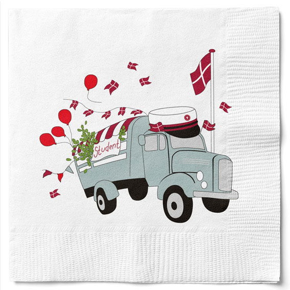 Disse fine servietter er dekoreret med en klassisk studentervogn, studenterhue, røde balloner og små Dannebrog, der straks leder tankerne hen på vogntur, glade råb og en dag fyldt med fejring ✨
